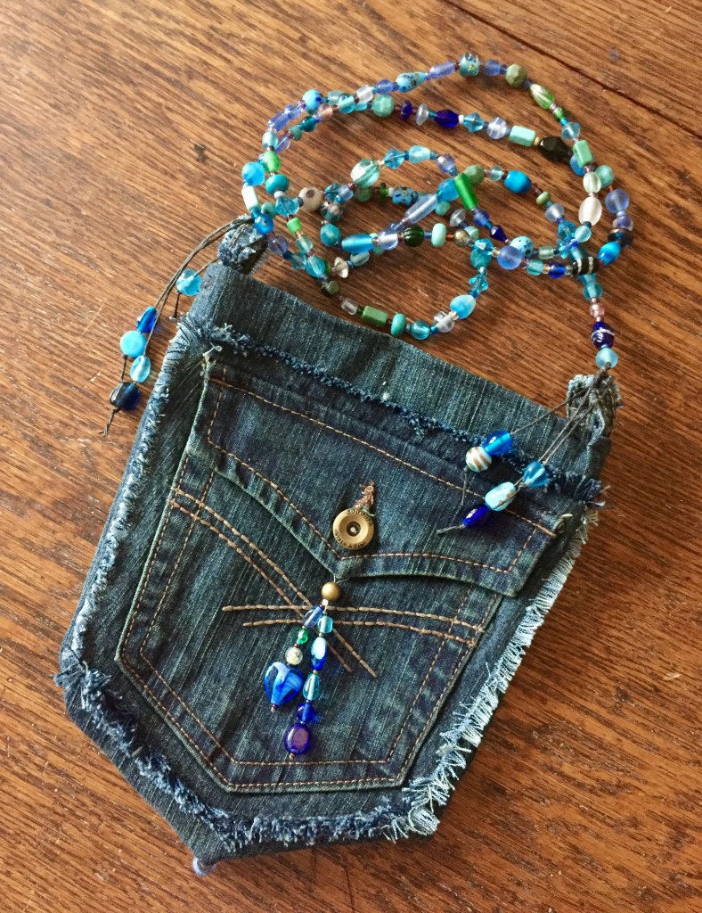 As with all things that you love, it is hard to let go and so is the case with an old pair of jeans. Instead of donating these jeans, I planned the little purse, lining the inside with a coordinating color of fabric and then, once assembled, created the purse strap out of leftover mismatched glass beads along with some little beaded tassels. I love recycling old jeans and hope to make some other purses. I look forward to sharing these with you.