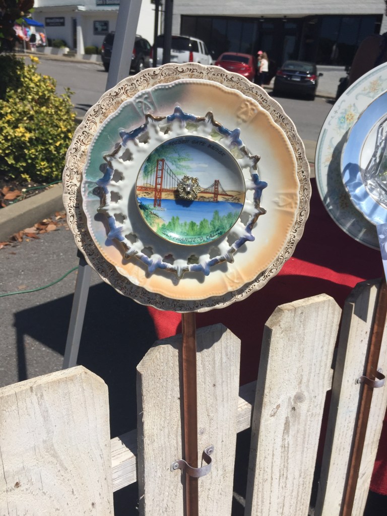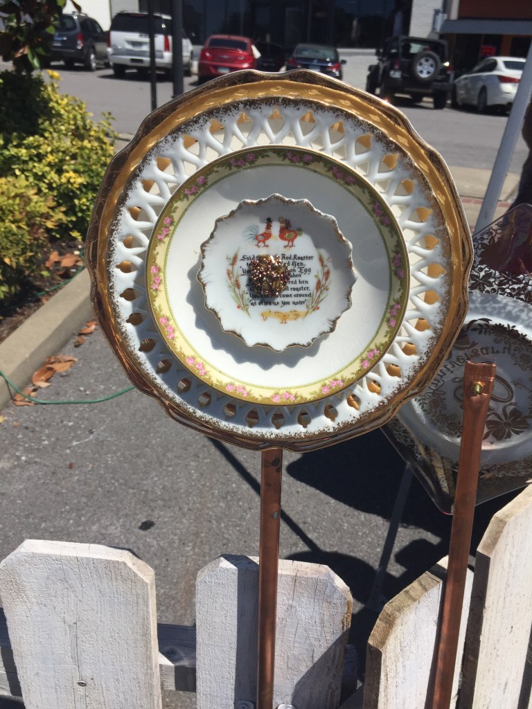 Another fun project I happened on quite by accident was my Garden Plate Flowers. One day, while out antique and junk store shopping, I found a place selling an amazing collection of antique plates, each with beautiful unique designs – some of the plates were commemorating a church, and then, others were identifying the personalities of a state. The one above was a plate from the golden gate bridge – so beautiful. I bought the plates, assembled them in themes and colors. Drilling holes in them and attaching to a copper pipe and then placing in gardens. The plates are stunning and hold up through cold and hot weather.